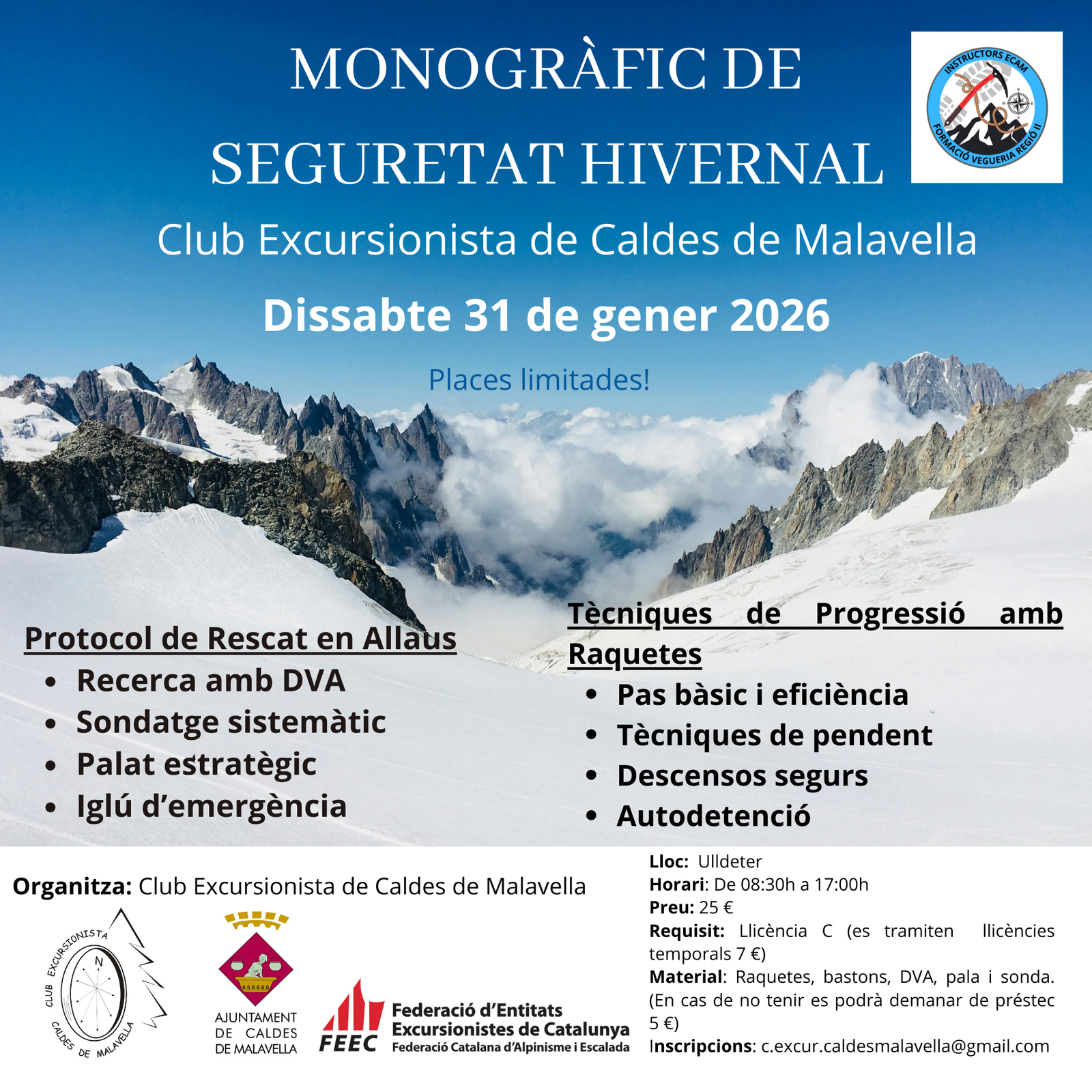 Material: Raquetes, bastons, DVA, pala i sonda. (En cas de no tenir es podrà demanar de préstec 5 €)